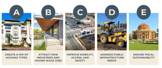 The 2045 General Plan process involved extensive community and decision-maker discussions regarding future growth and evolving community character. This engagement process helped inform the goals, policies, actions, and programs included in this General Plan. While each chapter discusses specific topics, the community and City Council identified a series “Big Moves” that establish the overarching focus of the 2045 General Plan. The Big Moves represent key land use objectives and strategies that will help advance the Vision and Guiding Principles (see Chapter 2) and define how the community grows and evolves into the future.